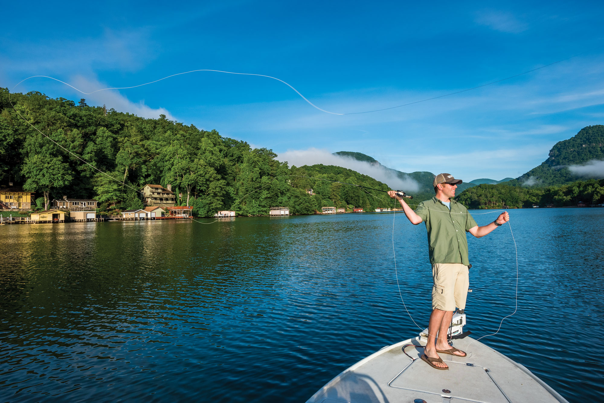 Fishing guide and owner of The Granddaddy Fly Fishing Experience, Michael Yelton casts a pretty curve, showcasing his skills over the mountain-ringed waters — up to 104 feet deep in some places — of Lake Lure. photograph by Emily Chaplin