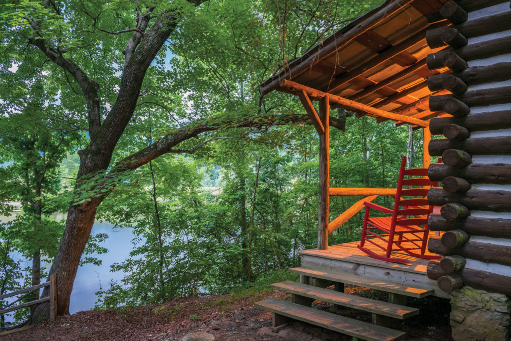 Pull up a porch rocker at Tootsie’s Cabin, one of the rentals at Pine Gables Log Cabins. photograph by Emily Chaplin
