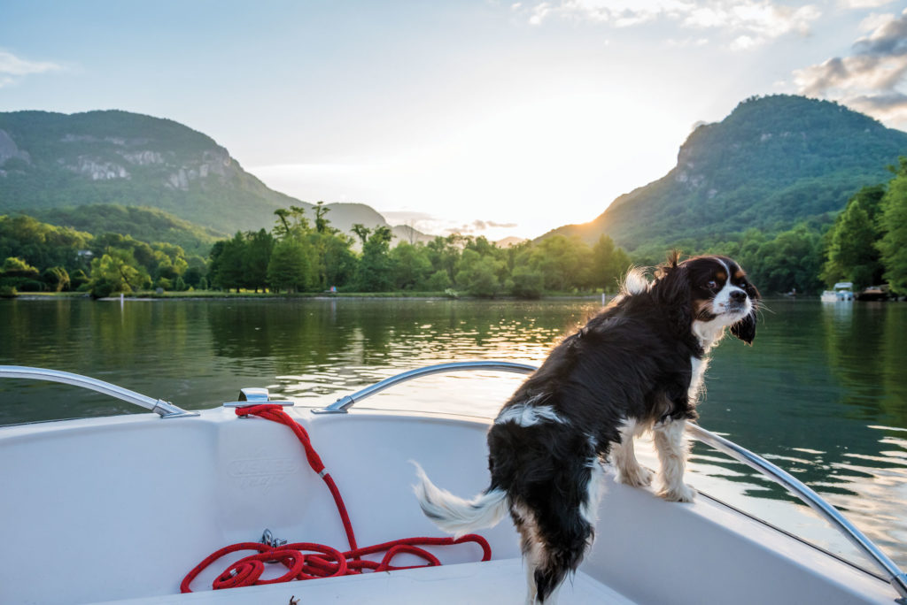 No whitecaps to worry about here. Whinnie, a Cavalier King Charles spaniel, hitches a late-day boat ride to Firefly Cove. photograph by Emily Chaplin