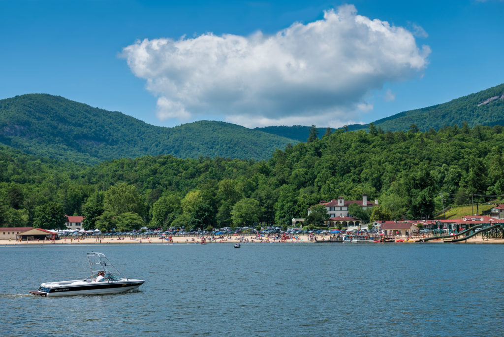 The only “beach” at Lake Lure, open to the public, stretches before the historic stucco Lake Lure Inn and Spa, first open in 1927. And not only historic, but famous: cast members of Dirty Dancing stayed here. photograph by Emily Chaplin