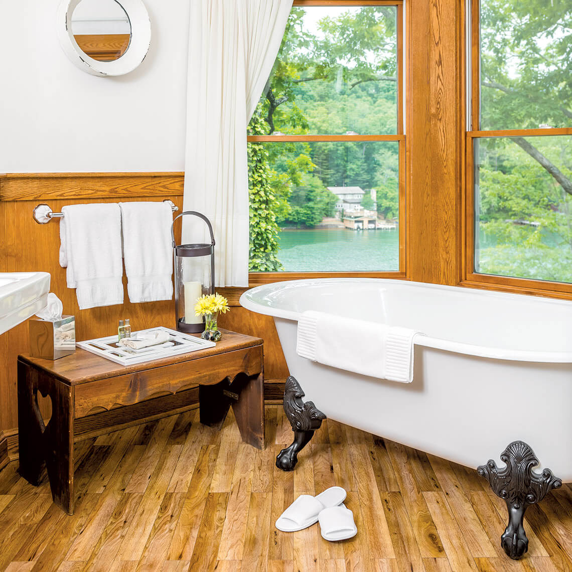 A bathtub with a bay window? All the better for lazing and gazing from the Lodge on Lake Lure. photograph by Emily Chaplin