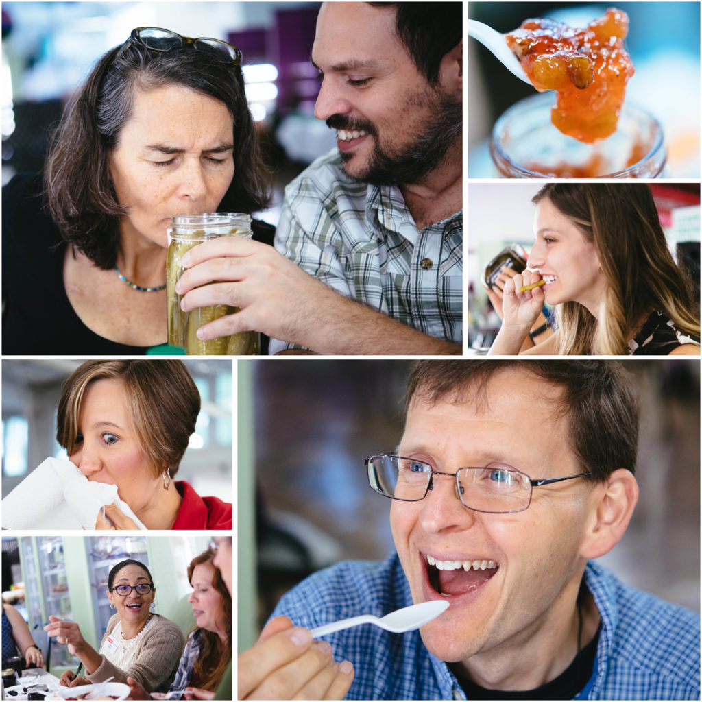 Taste-testing has its pleasures and perils, as the judges learn (clockwise from top): Rose Hoban and Reno Palombit smell a brine; compote draws raves; Savana Everhart bites a dilly bean; Gunter is all smiles; Debra Stroud, Annie Hardison-Moody, and Dara Bloom confer; Lindsay Goolsby gets a sour surprise. photograph by Andrew Kornylak