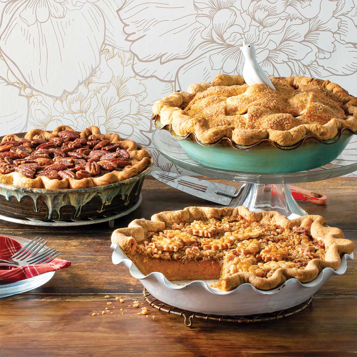 Asheville’s Baked Pie Company is famous for its pie flights, but sometimes, only the whole dessert will do. Serve the bakery’s sweet potato, honey pecan, and apple pies in Muddy Llama Pottery — made by Cathey Chet in Henderson County — for extra mountain magic. photograph by Tim Robison