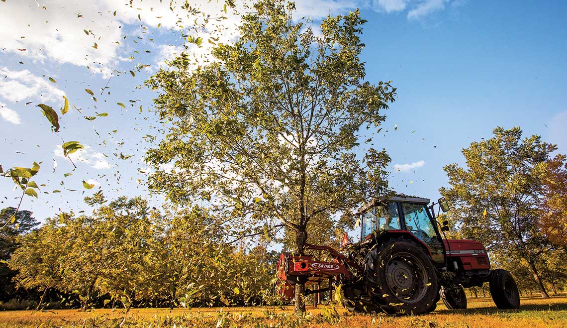 During the fall harvest season, the Taylors use a “tree shaker” attached to the back of a tractor to free the pecans from their trees, unleashing a brief hailstorm of nuts and leaves. photograph by Chris Hannant