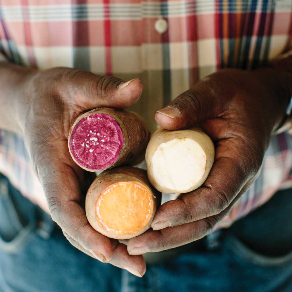 Pine Knot Farms’ sweet potatoes, including purples, orange Beauregards, and white Bonitas. photograph by Anagram Photo