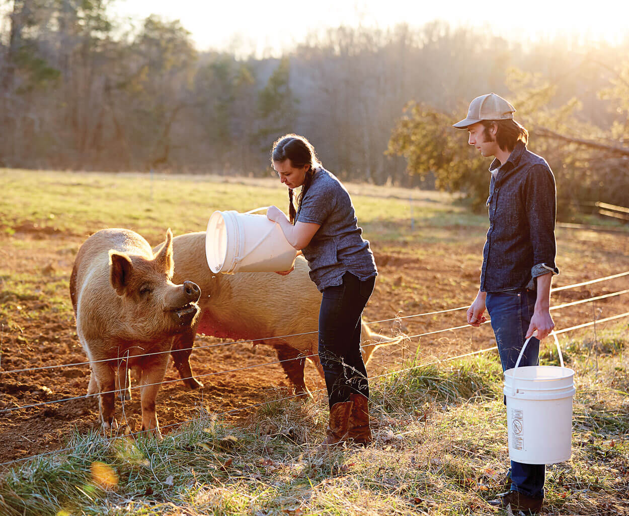 They’re making a go of it here in Rockingham County, trying to ride the rhythm of the seasons, always tinkering, planning, trying to see over the next rise. They’ve got a brand-new tractor that came in handy after Hurricane Michael took down dozens of trees. They might trade out the sheep for more space for cows. For right now, Worth says, it’s enough that they set their own schedule. For right now, it’s just whatever tomorrow morning’s chores might bring. It’s getting ready for market 50 Saturdays a year. “And it’s just being here,” Hillary adds. She leans close to Worth. “That,” she says, “and we get to eat some really amazing meals.”