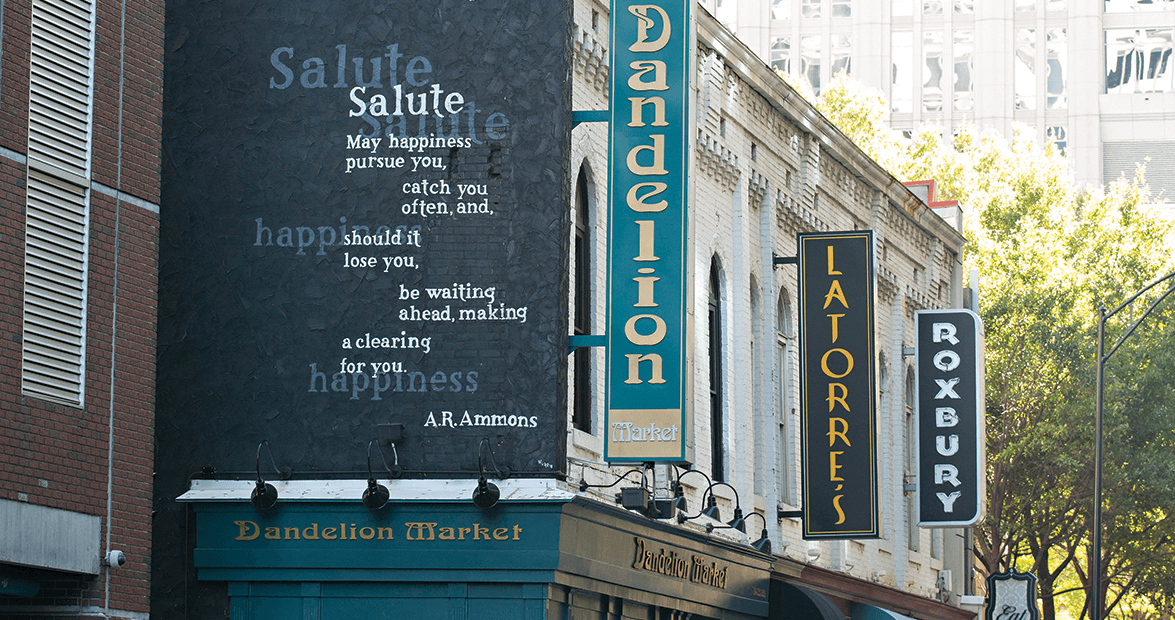 Bagwell wrote Ammons’s late widow a seven-page letter to ask for her blessing. Carew asked the owners of the Dandelion Market if they could paint their wall black and the words white. Students at Central Piedmont Community College helped design it. Reporters came. Oh, neat, they said. Charlotte didn’t have one of these before.