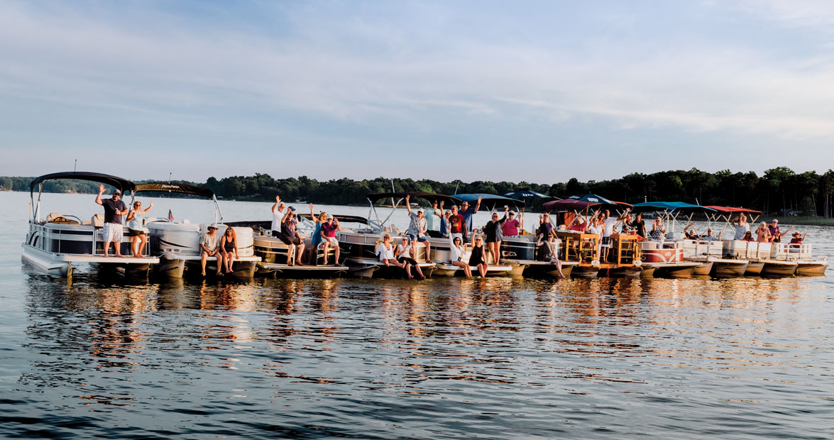 A silvery pontoon boat pulls up alongside Jim and Paula Noonan, music blaring. “How are you, hon?” yells a woman in sunglasses and a bathing suit cover-up. “Hey darlin’, good to see ya!” Paula hollers as she helps secure the boats, linking them with the three pontoons floating together on High Rock Lake. Meanwhile, another pontoon has already pulled up next to the first one — followed by another one — adding to the growing chain. Soon, 13 pontoons are lined up and tied together, bobbing in the middle of the lake near the mouth of the Yadkin River.