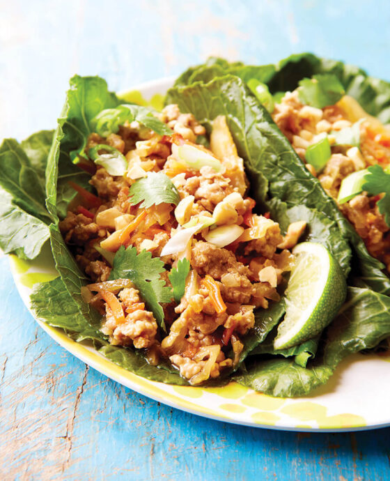Spoon approximately ¼ cup of ground pork mixture into center of each collard leaf. You may need to use two leaves overlapping, depending on size. Add toppings as desired. Fold ends of collard leaves over the pork mixture and roll tightly. Serve warm.