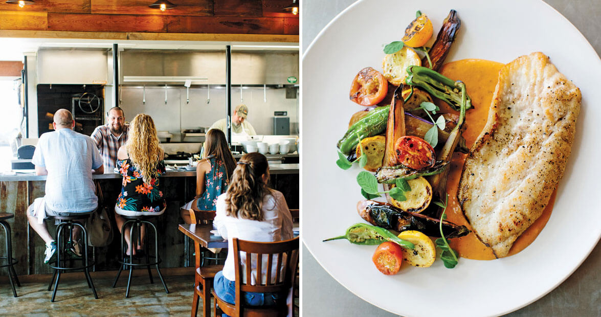 Postal occupies a distinctive mid-century building that served as a post office for 40 years, until 1997. After that, the space either sat idle or housed oddball things, such as batting cages for Little League practice. But as soon as James and Bill stepped inside, they could see that it was the ideal spot for the business they’d dreamed of; from that day forward, they called their restaurant Postal Fish Company. Before opening, they gutted the old post office’s interior, brightening the space with natural light. An open kitchen allows them to greet and chat with customers, who can, in turn, keep an eye on what’s cooking. The focal point is an Argentine-style wood-fired grill — a medieval-looking contraption with a flywheel and chains that raise and lower the heavy grate over hardwood coals. Two of their most famous dishes, roasted whole fish and wood-charred shrimp, come off that grill, as do some of their most popular side items, such as carrots and beets, which roast in the embers.