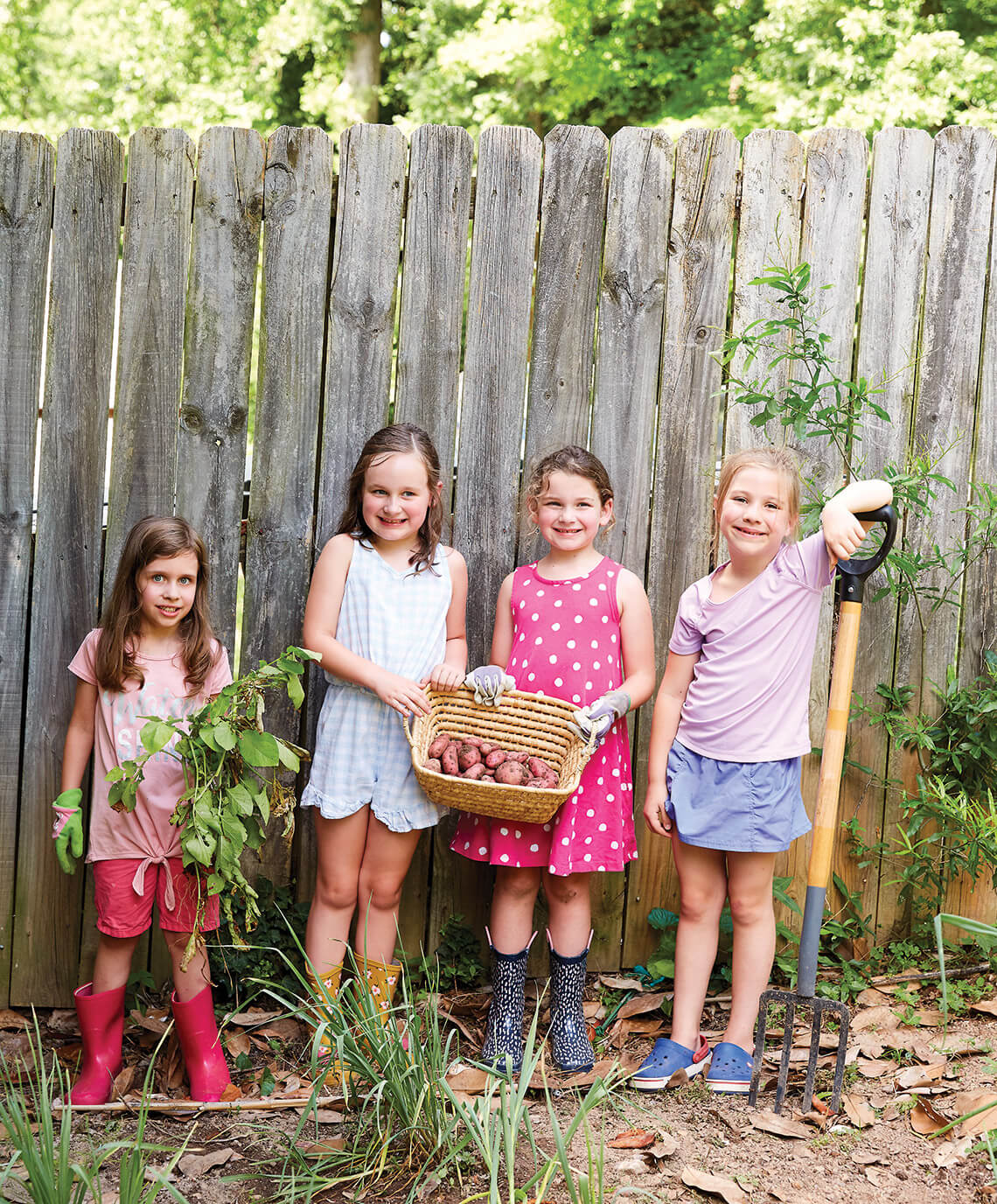 Employing a team of 6-year-old gardeners at harvest time may not be the most efficient way to dig potatoes, but it’s the most memorable. From left: Sydney Bowman, Norah Muir, Oona Dulaney, and Estella McClosky. photograph by Stacey Van Berkel