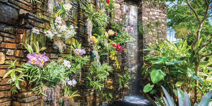 Daniel Stowe Botanical Garden’s Orchid Conservatory is a five-story glass house filled with tropical plants.