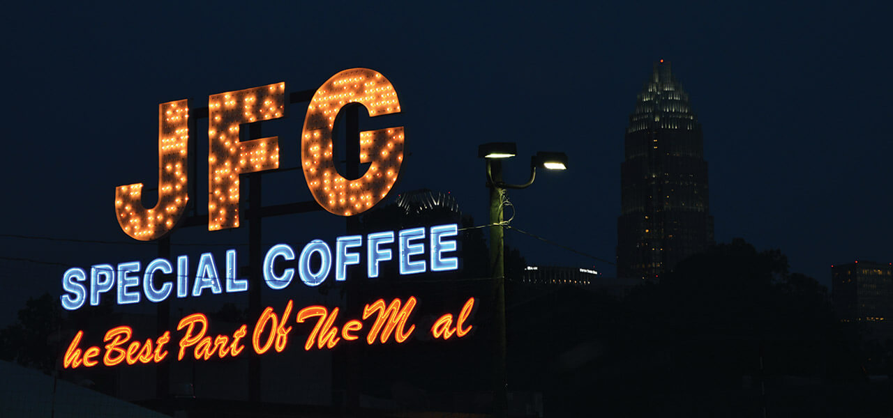 Towering above the city of Charlotte between 1964 and 2009, a giant letter J would illuminate from bottom to top, followed by an F, and then a G, as if three enormous coffee cups were filling up with light. Then, the letters would flash, the light would drain away, and the animated sign would commence performing its magic trick all over again. For more than four decades, the famed JFG Coffee billboard was arguably the most visible landmark in the Queen City.
