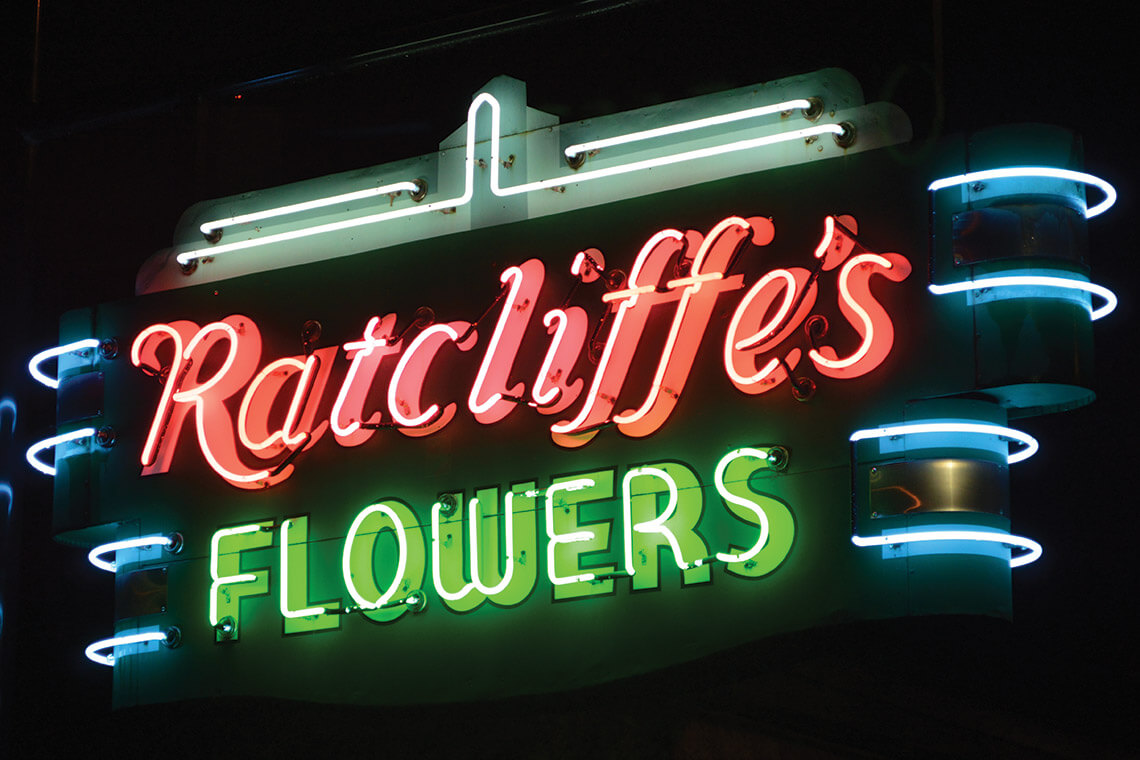 The neon Ratcliffe’s sign has endured since the 1920s. photograph by Christopher Lawing