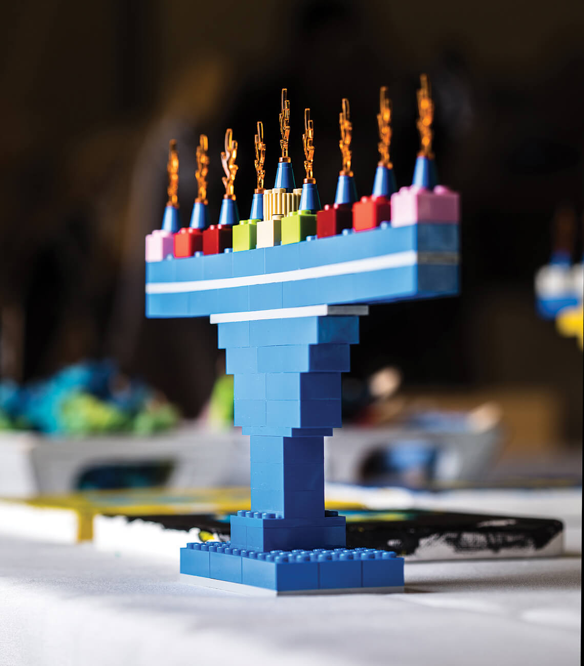 By noon, when the synagogue’s men’s group, the TBO Brotherhood, started selling deli sandwiches off to one side, two new vendors had begun to draw a clamor. Customers were forced to form lines to get a closer look at 8-year-old Noah Gluckowsky’s Lego menorahs, stylized in colorful patterns. Noah sat beside his baby sister and seemed dazed by the compliments he was getting. Fortunately, his gentle parents were there to field questions.