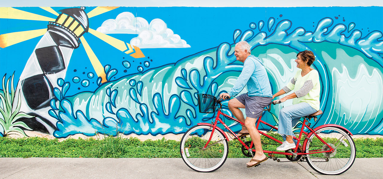 We cruise past children’s tricycles parked haphazardly under live oaks, pedal through the scent of a charcoal grill, see beach towels hanging from porch banisters, and listen to the trilling notes of laughter from neighbors mingling in the yards.