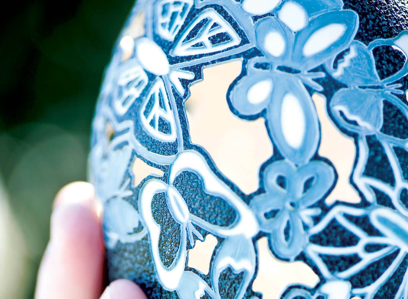 From smallest to largest, she works on duck, goose, emu, and ostrich eggs. The smaller eggs are thinner and can’t withstand as much carving as the large eggs; still, they are far sturdier than chicken eggs. Ostrich shells are the thickest and most durable, ideal for being carved and pierced, and emu shells are prized for their layers of color — a deep, green-black on the outside, teal or lavender in the middle, and white on the inside.
