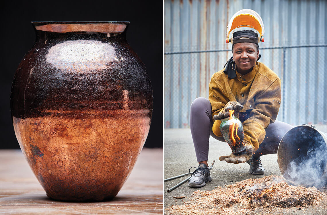 Durham ceramist Delores Farmer often uses a firing technique called raku to give her vases a one-of-a-kind glaze and texture. The process ensures that no two vessels look exactly alike. photograph by Alex Boerner
