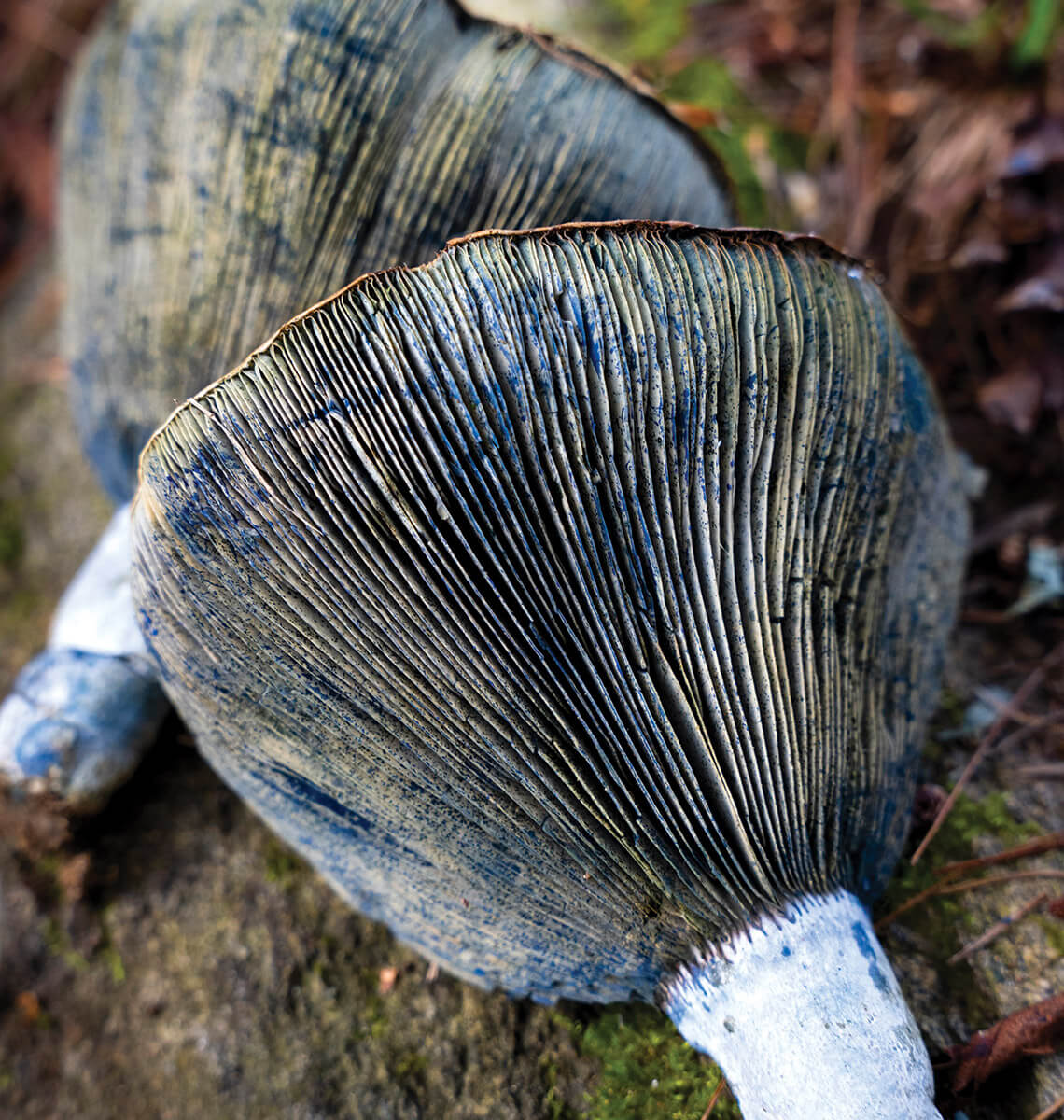 Indigo milk caps, or Lactarius indigo, get their unusual blue color from a compound in the milky substance they exude, which sometimes turns dark green after being exposed to the air. photograph by Erin Adams