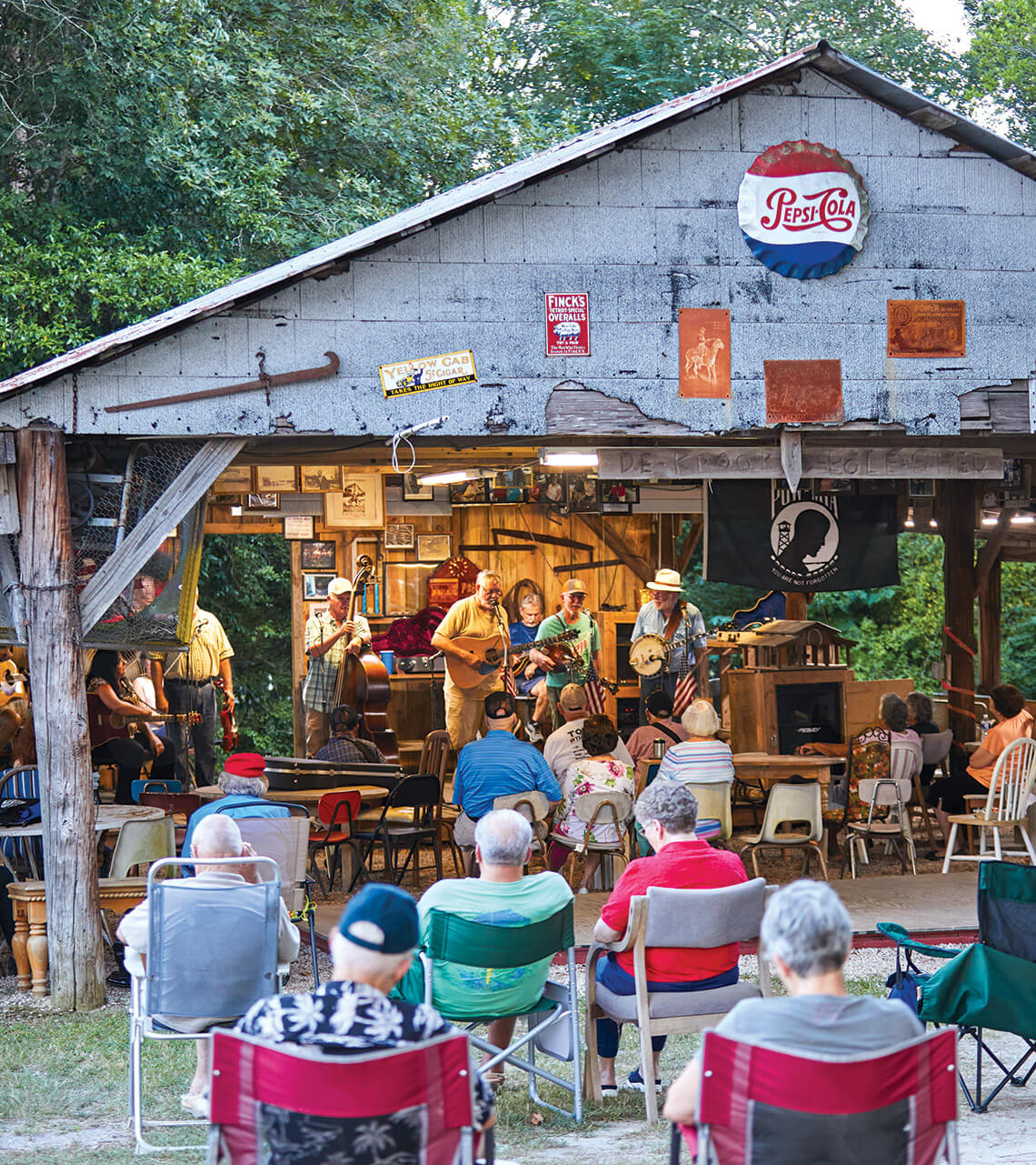 So in 1999, with the help of the community, the shed was moved, piece by piece, to its current location. Everyone pitched in: One friend volunteered his forklift, a second donated telephone poles to be used as support beams, and a third added sides and a stage. Local cloggers, who wanted a place to dance together, installed a dance floor, too.