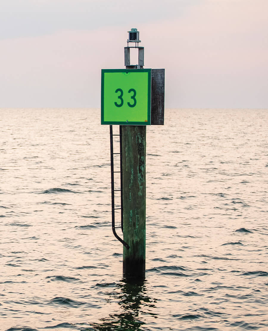 Typically, boaters can use the expression “red, right, returning” to remember to keep red markers on their right when returning to port. But on the water, as in life, there are always exceptions: Heading south on Roanoke Sound, green markers — like G33 — should be on the right. photograph by Chris Hannant