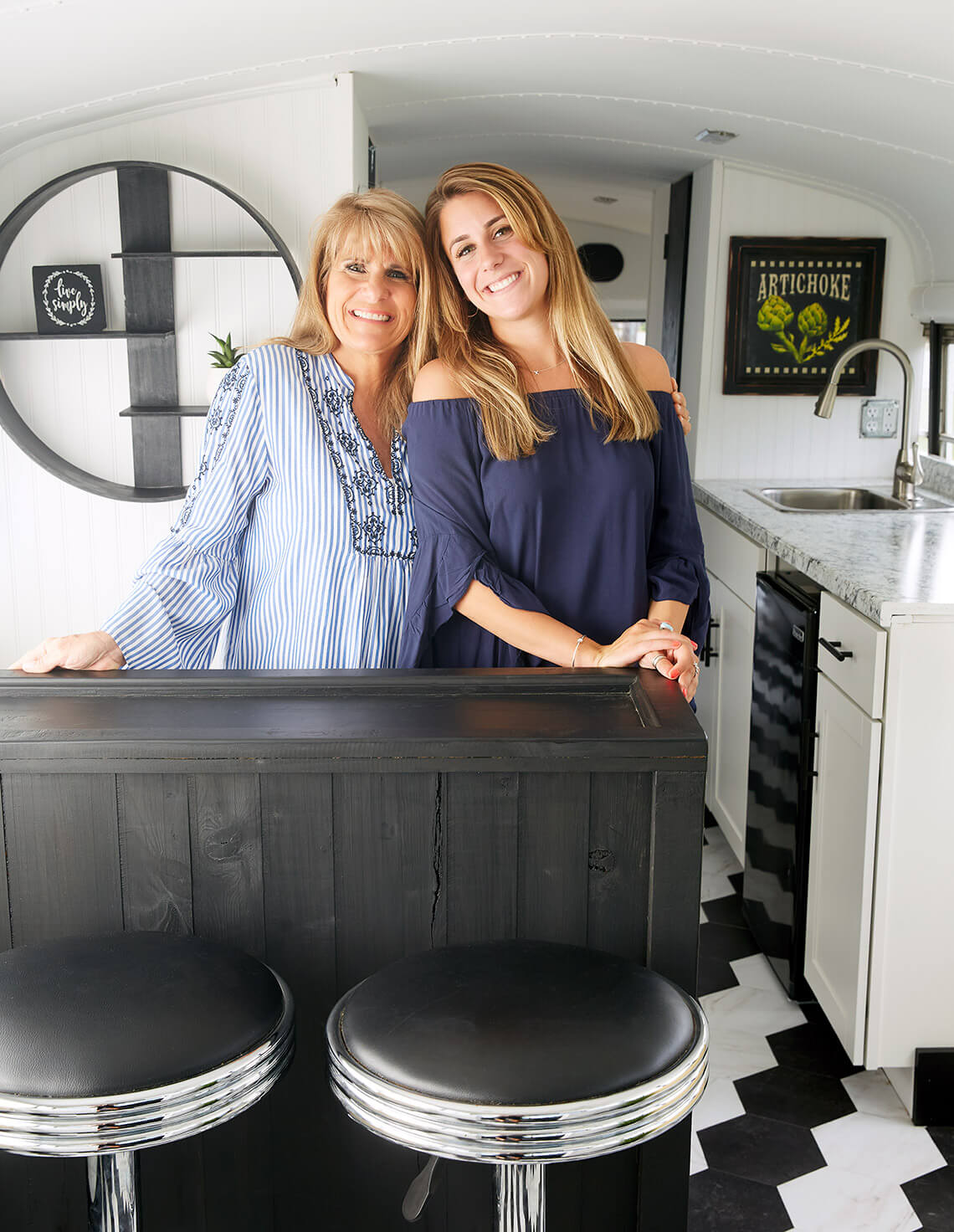 Megan Donahue and her mom, Lisa, love decorating day. They kick off the morning with celebratory mimosas while jamming out to artists like Hall & Oates, Marvin Gaye, and Elton John on Spotify’s “’70s Road Trip” playlist. When the drinks are done, the work begins as they stage their renovated school bus, now a tiny house on wheels, to get it photo-ready.