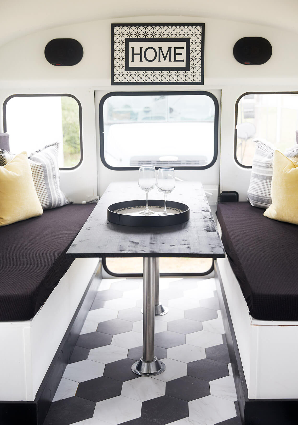 Over the next two months, Megan, Lisa, and a family friend ripped out the bench seats, painted the interior and exterior, and installed flooring, cabinets, furniture, and a bathroom. The bus was transformed from yellow outside and lime green inside to black and white throughout.