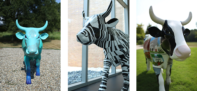 RTP is a bastion of science and research, but there’s room for art, too. Painted members of the “Cow Parade” exhibit, including “Aqua Cow,” “Binary Bovine,” and “100% Certified Locally Grown Durham Bull,” bring a little whimsy. photograph by Natalia Weedy