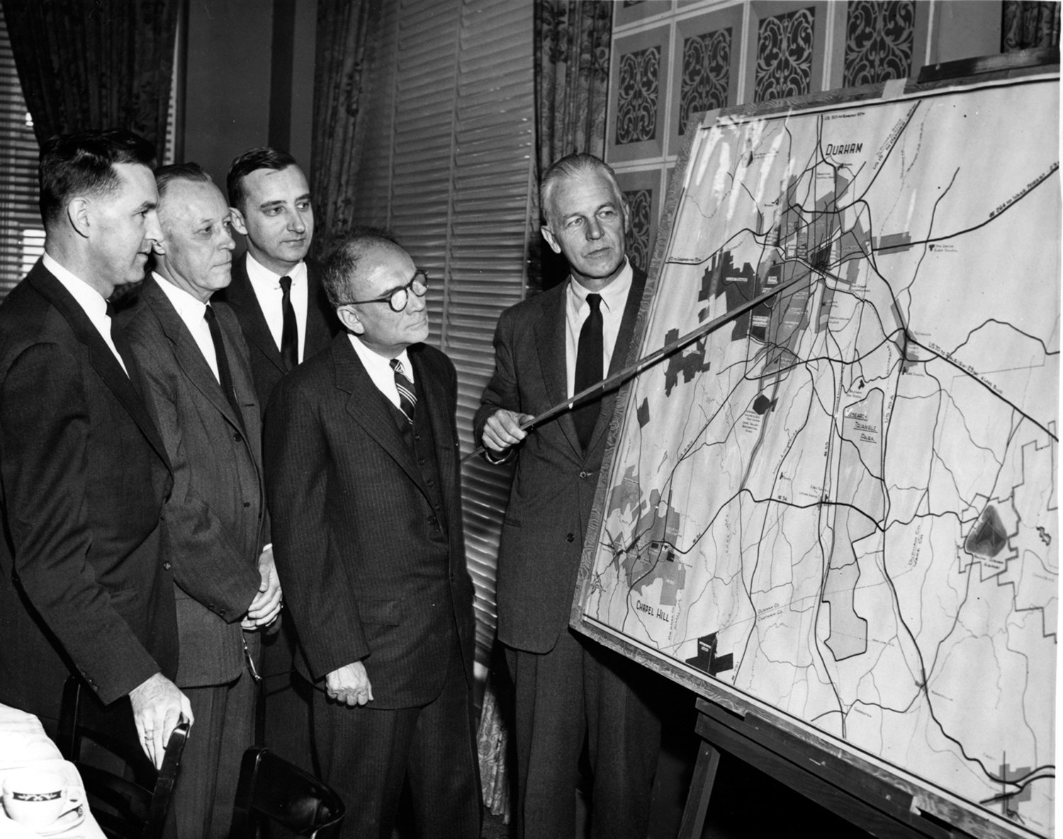 “He comes home with a renewed commitment to North Carolina,” Geolas says, “to doing things at home.” Davis earned his degree at UNC, then got a job right around home at Wachovia Bank. It was kind of a big job; before he was finished, he was chairman of the board. He served two terms in the North Carolina State Senate and was the president of the United States Chamber of Commerce. So when, in the 1950s, the Research Triangle Park concept was struggling to be born, Davis was the natural person for developers to turn to.