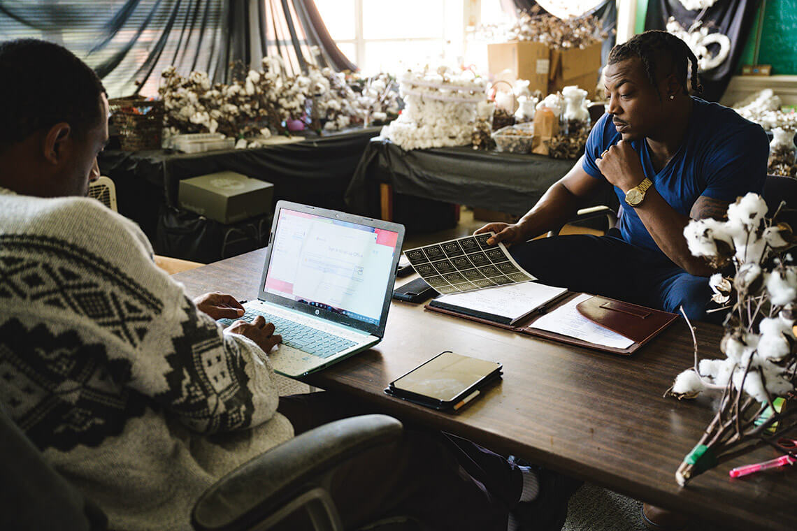Inside one of the rooms, Jamaal Garner, Julius’s childhood friend and Black Cotton’s operations manager, strolls from one pile to the next, breaking down the cotton bolls and separating out the seeds. Once the seeds are removed, he can begin designing one of the wreaths that the company makes and ships to customers as far away as Seattle. For products like these, the bolls are harvested and cleaned by hand. It’s a meditative process, and for the wreath that Jamaal is making, he carefully arranges the husks around the edges until he likes the way it looks.
