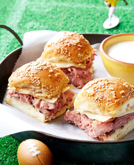 For the sliders: Preheat oven to 350°. Butter the bottom of a 9 x 13-inch baking dish. Without separating the rolls, slice the package of rolls horizontally in half. Place the bottom half of the rolls in the baking dish. Top with 6 slices of cheese, roast beef, the remaining 6 slices of cheese, and the top halves of the rolls.
