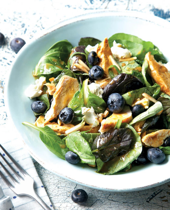 For the salad: Place spinach leaves in a large serving bowl or on individual salad plates. Top with chicken, blueberries, almonds, and goat cheese. Chop mint or basil leaves just before serving and place atop salad. Drizzle reserved vinaigrette over salad if desired.