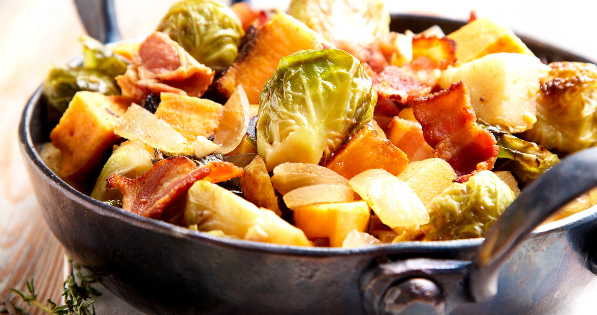 Reduce skillet heat to medium. Add the apples, thyme, and cinnamon to the onion-garlic mixture. Cook for 10 minutes or until the apples are just tender. Add chicken stock, brussels sprouts, and sweet potatoes. Simmer, stirring occasionally, for about 5 minutes. Add additional salt to taste. Pour into a large serving bowl and top with crispy bacon. Serve warm.