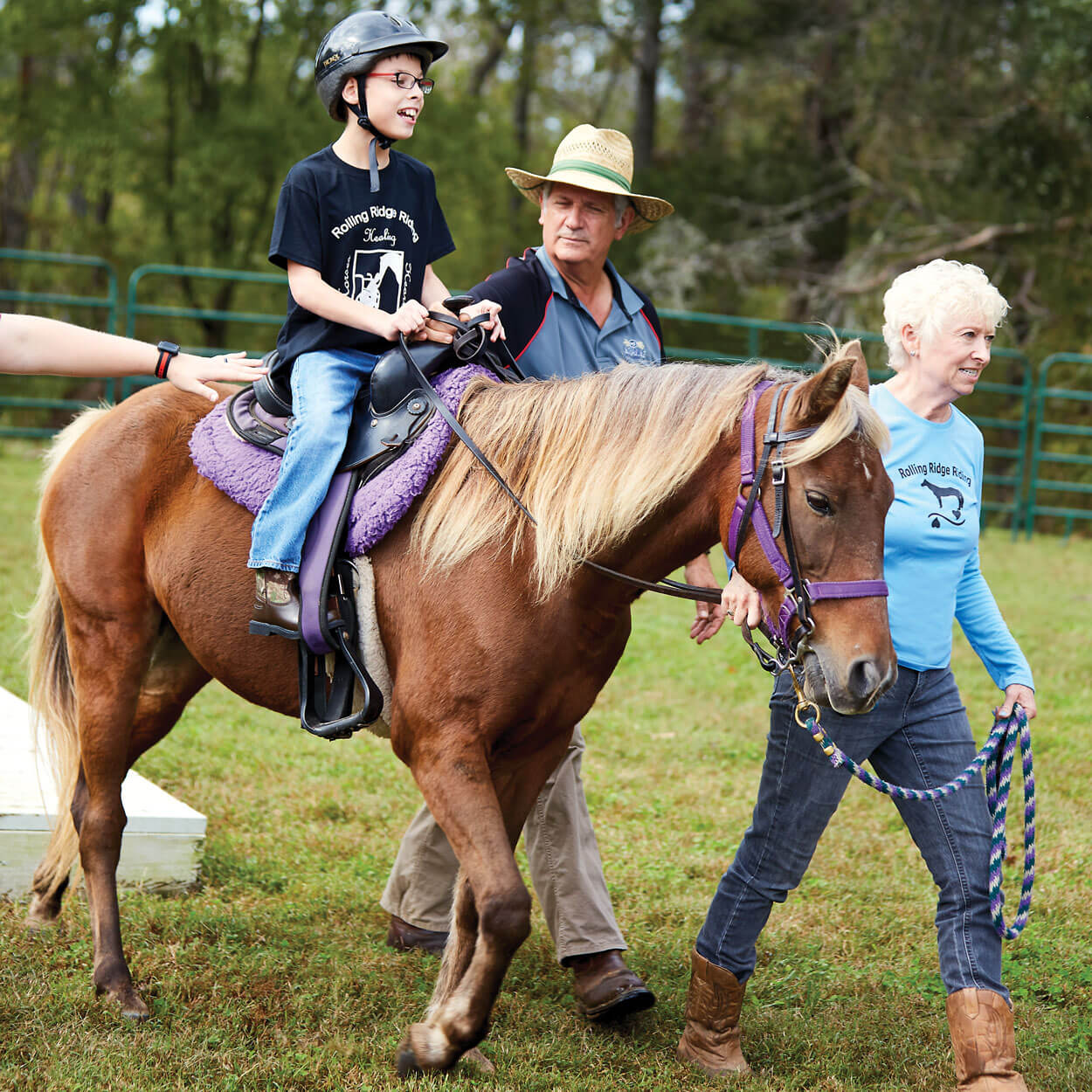 Davis became a certified hippo-therapist and opened Rolling Ridge Riding as a nonprofit. Today, eight horses provide tailored therapy rides and lessons to children with a range of physical and behavioral disorders. These docile creatures are “bomb-proof,” Davis says. “There’s not a single horse in North Carolina that could stand against them — I don’t care how many medals they’ve won at horse shows.”