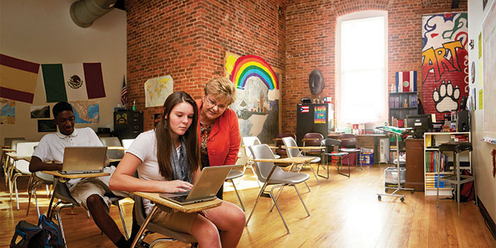 No dust motes float in the halls of the two-story building. Pipes of every diameter, from an inch to two feet, ferrying heat and air-conditioning, water and electricity, have been left exposed. They’re silver and black and red and only enhance the high, easily 25-foot ceilings. Middle school grades and administrative offices are located on the first floor, high school principal Darkarai Bryant explains. High school classrooms and the library are granted second-floor status, which, in the academic food chain, seems only fitting.