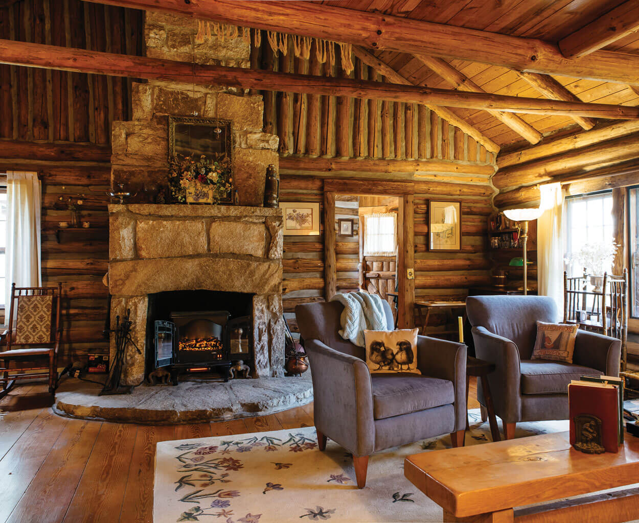 Marlene and John Schiffli’s Joe Webb cabin features a unique fireplace — Webb designed it on the interior instead of on an outside wall because he felt the stone would help keep the living room warm. photograph by Tim Robison
