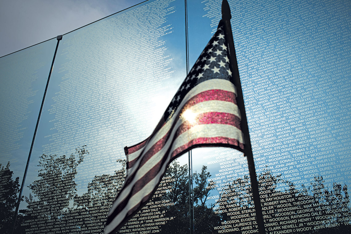 The names of those who died in the Vietnam War are etched on glass panels at the Onslow Vietnam Veterans Memorial at Lejeune Memorial Gardens. photograph by Andrew Craft