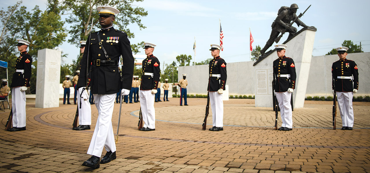At the gateway of downtown Jacksonville stands Lejeune Memorial Gardens, a unique collection of memorials all instituted by the people of the community; none were mandated or compelled by any other cause. The memorials are within short walking distance of one another, yet each is entirely different. The Beirut Memorial commemorates what Hargett believes is Jacksonville’s second most important day, October 23, 1983. In a matter of seconds, thousands of pounds of explosives killed 220 Marines stationed as peacekeepers housed in a barracks in Beirut, the greatest loss of life for Marines in a single day since D-Day at Iwo Jima. The majority were based at Camp Lejeune. “They were our neighbors,” Hargett says, “the Sunday school teachers, the soccer coaches.” In a wooded, landscaped area, one of the memorial’s granite walls reads, “They Came in Peace.” The wall on the left bears the names of the lost. In a niche between the two broken walls, a statue of a Marine stands watch, underscoring the fact that these men were serving as peacekeepers, not fighters. Designed by North Carolina State University graduate students, the memorial is one of the largest military memorials ever constructed and paid for by private donations.