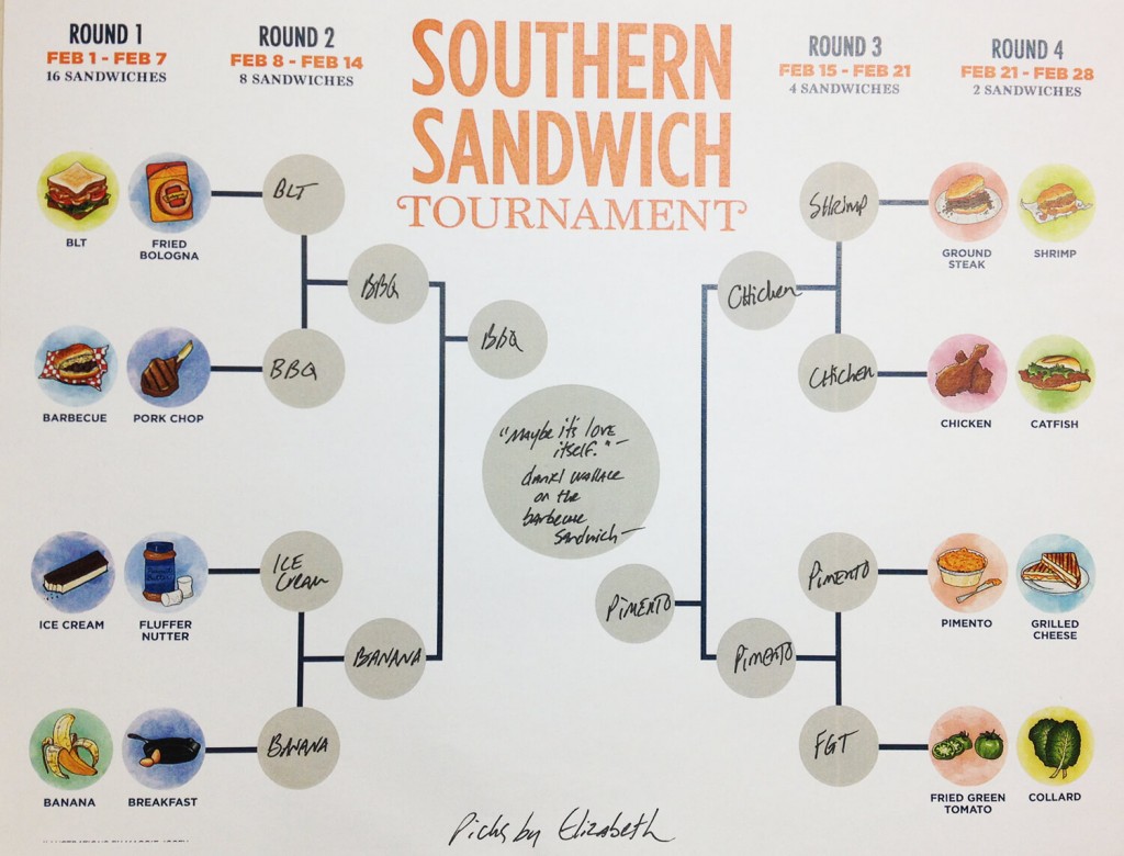 Which two sandwiches will head to the final round of the tournament? Barbecue or breakfast? Fried chicken or pimento? Have your say.