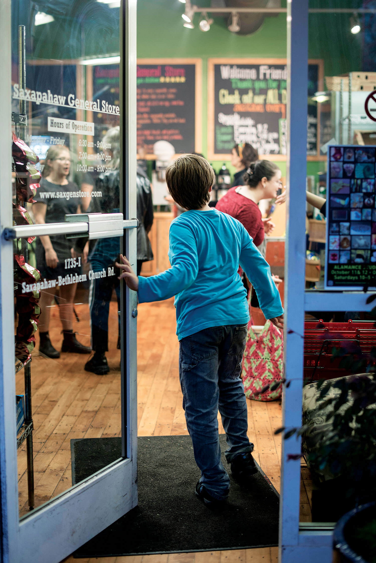 Here is the sole building in Saxapahaw that hasn’t been completely remodeled inside and out. It’s the last retail link between the old town and the new. Old-timers can find a lot of the things they used to find here, including cigarettes and Charmin, Gatorade and Pine-Sol. But note: Right next to the Pine-Sol is Ecover (100 percent naturally derived solvents), and next to the Charmin is Seventh Generation (100 percent recycled), and next to the Gatorade is kombucha. This is why the shop plays such an important role in the new Saxapahaw: Everyone is welcome here. Some of the residents would probably like to see the cigarettes go, for instance, but others wouldn’t, and Jeff and Cameron believe that a general store, by its very nature, should serve the entire community.