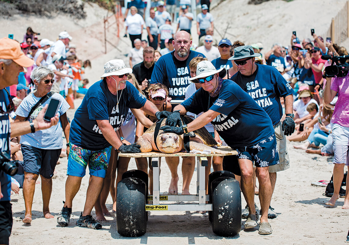 To ferry large turtles — like Big Guy — from the street, over the dunes, and onto the beach, turtle hospital volunteers use an inventive solution: the turtle taxi. photograph by Matt Ray Photography