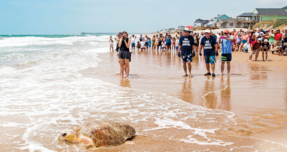 Their new journey begins a few miles south at Topsail Beach, with a brigade of pickup trucks carting turtles and volunteers to a designated spot on the shore. By the time they arrive, the area is already full of locals, grade school classes, and bathing-suited, sunscreened, water-bottled onlookers. Eventually, hundreds will line the beach. One year, more than 1,000 people turned out to watch. Jean waits until the last possible moment to share the release date, but, no matter what, there’s always a crowd.