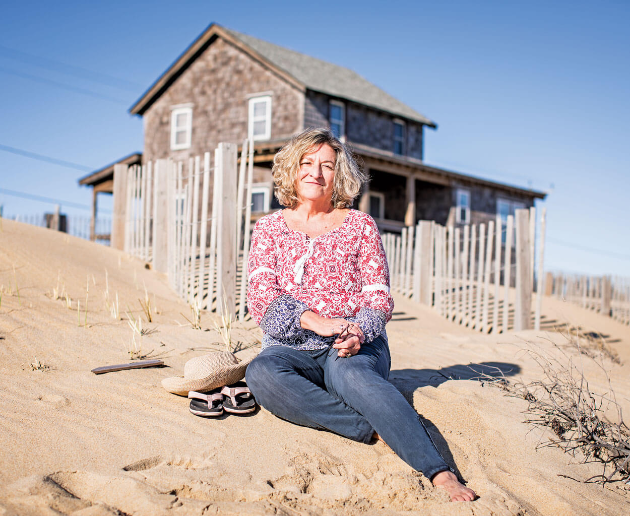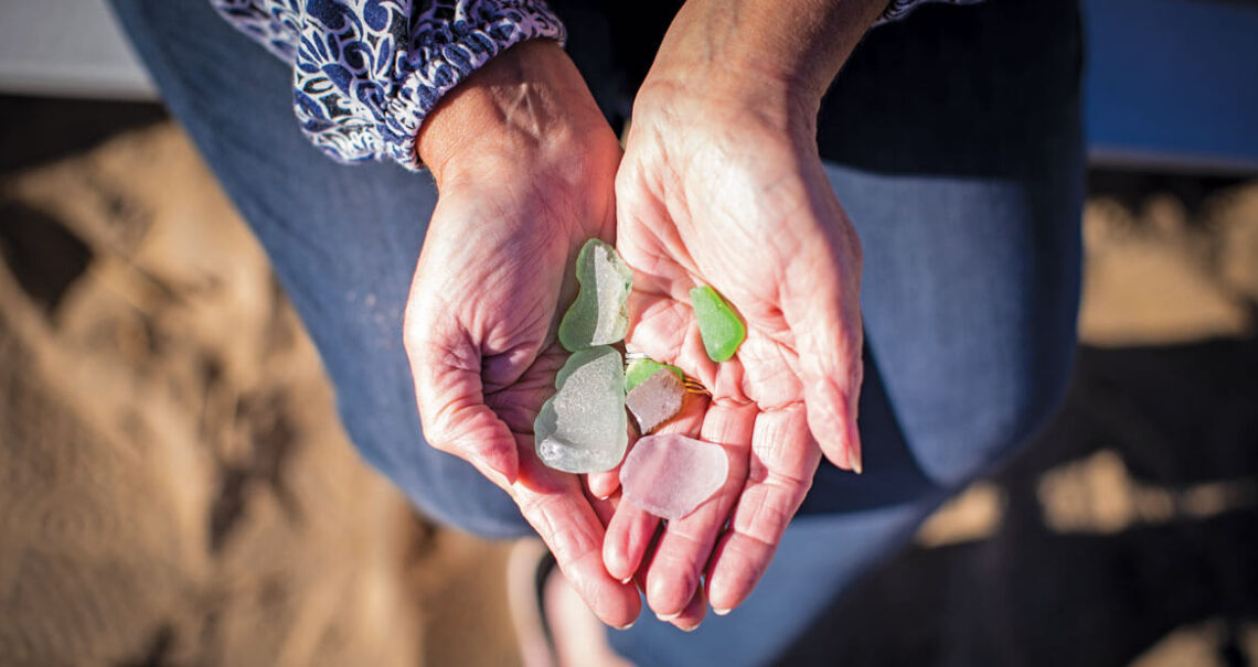 “I hear sea glass calling to me on my beach walks,” artist Margaret Miller says, leaning forward as if to share a secret. Her unruly blond curls fall loosely around her face. The calls come to her as she walks the sand in Kill Devil Hills, pulling her to tangles of seaweed or other places where sea glass likes to hide. After a hurricane or a nor’easter, when big surf churns up ocean treasures, she searches the shoreline at low tide, always abiding by certain rules: No digging, for example. Sea glass appears to her as a gift; she won’t put shovel to sand. Also: No altering. She wraps sea glass in wire instead of drilling into it. And once she picks up a piece, she will not put it back down. She trusts her intuition.