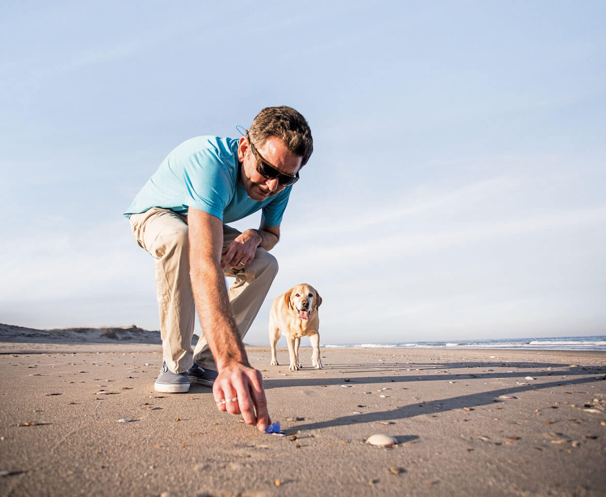 Outer Banks metalsmith and jewelry artist Mark Slagle and his dog, Rusty Banjo, hunt for colorful, ocean-tumbled bits of glass in Nags Head. photograph by Chris Hannant