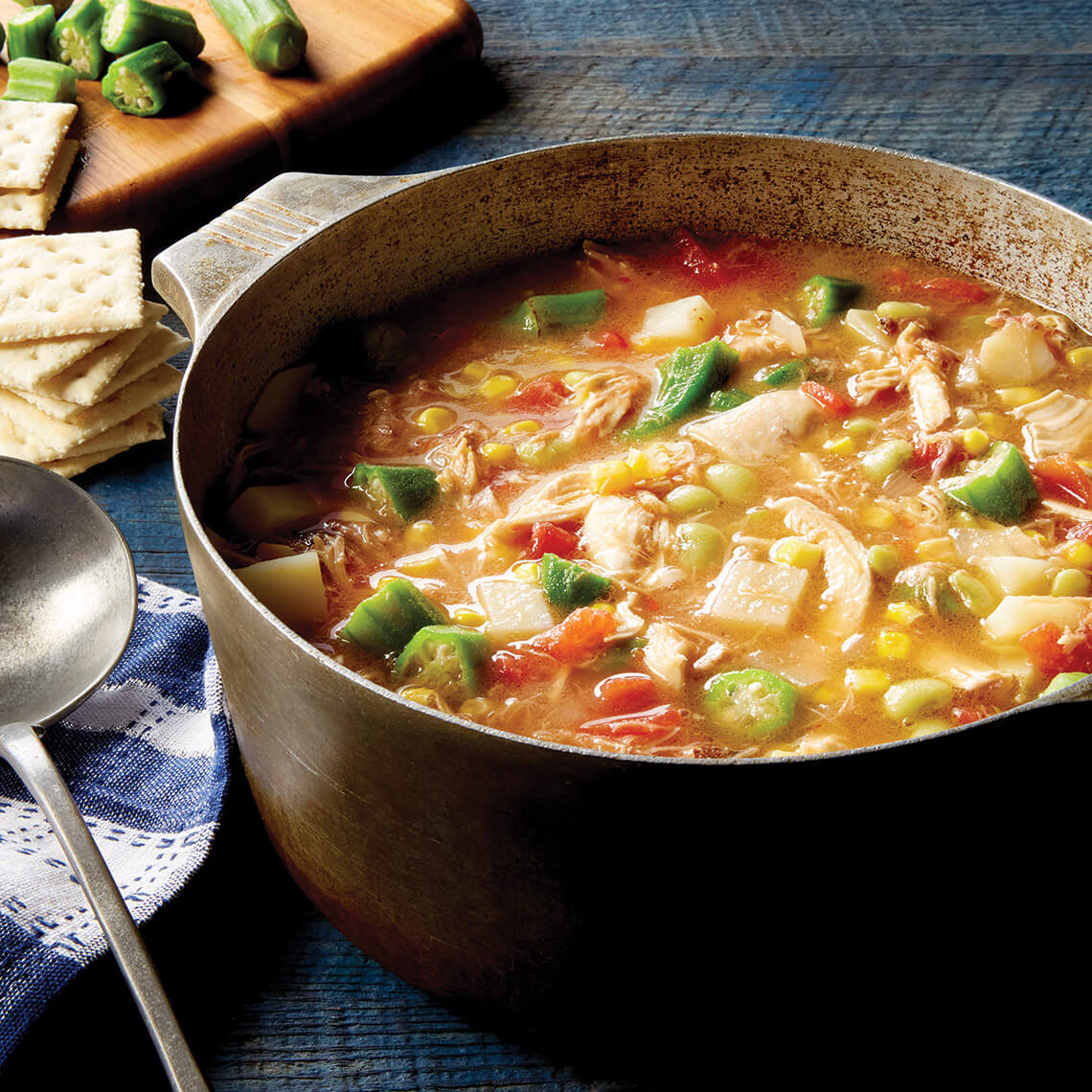 Add corn, tomatoes, lima beans, onion, and potato to stock. Cook on medium heat for 20 to 30 minutes. Add barbecue, okra, red pepper flakes, salt, black pepper, and Worcestershire sauce. Continue cooking for another 10 to 15 minutes or until stew thickens. Add more water if stew is too thick. Serve with saltine crackers.