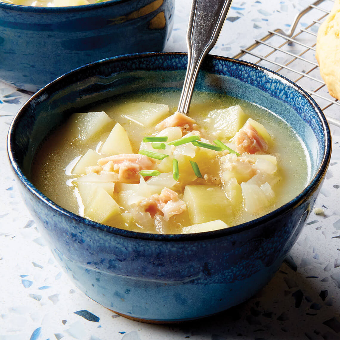 Add the shrimp stock, potatoes, and the salt. Simmer until the potatoes are almost done, about 15 minutes.