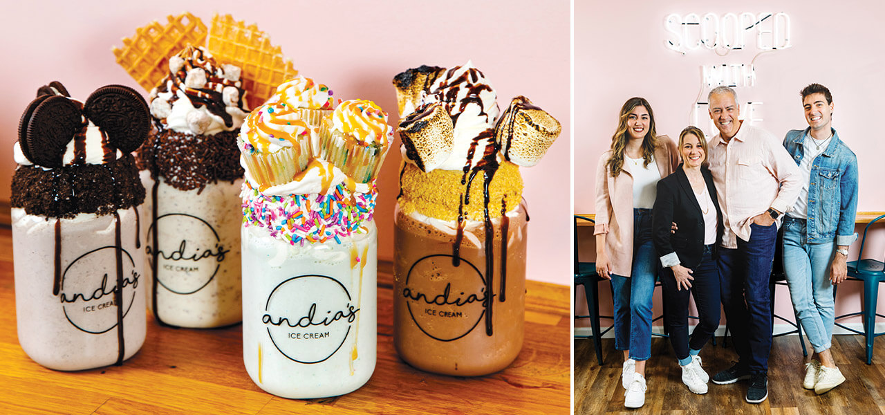 As a child spending sweltering summer days on the island of Cyprus, Andia Xouris longed for rose-flavored ice cream. Decades later, when she and her husband, George, decided to start an ice cream business, rose pistachio was one of the first flavors she mastered. Much to their surprise, it became one of their best sellers. The Xourises both grew up among Greek relatives for whom family was everything — and ice cream was important to George, too: His beloved grandfather worked at a coffee shop with an old-fashioned ice cream counter when he arrived in New York from Greece. “When we sat down at the kitchen table as a family to talk about really doing this, we realized, ‘Oh my gosh, wait a minute — George’s grandfather’s ice cream scoop is right there in the drawer,’” Andia says. “It gave us all goosebumps, and we were so excited and honored to carry on the family business. It was just so incredibly inspiring.” And while their ice cream often inspires road trips from Winston-Salem, Fayetteville, and beyond, it’s the milkshakes, piled high with locally made mini cupcakes, cookies, torched marshmallows, and whipped cream that are posted all over social media.