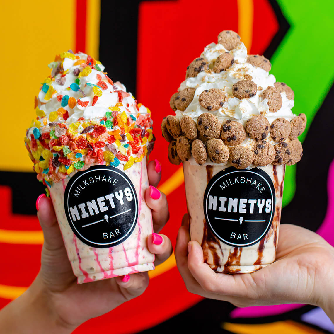 As a kid, hardly anything beat watching Saturday morning cartoons while eating an outrageously oversized bowl of cereal. Except maybe ice cream for breakfast. So in 2017, when Darith Ngear took over the Charlotte sandwich and ice cream shop that his mom, Srear, had run for 12 years, he decided to go all in on nostalgia. “My mom is a Cambodian immigrant, and it was her dream to open a shop when she got to America. I wanted to keep it going, but I also wanted to do something new,” Ngear says. “I wanted to take my childhood growing up in the ’90s and relive it — and if you’re going to relive your childhood, you’ve got to have sugary cereal.” At Ninety’s Dessert Bar, that comes in the form of a super creamy milkshake called The Bottom of the Cereal Bowl: vanilla ice cream, condensed milk, and your choice of cereal mixed in and sprinkled on top of a mountain of whipped cream. Favorites include Fruity Pebbles, Lucky Charms, and Biscoff Cookie Butter. Milkshakes featuring the flavors of other classic childhood treats — like Dunkaroos, Strawberry Shortcake bars, and Drumstick ice cream cones — are also popular. But even before they order, former ’90s kids begin to grin when they see the shop’s paintings of cartoon characters from shows like Rugrats, Hey Arnold!, and Dexter’s Laboratory. “As you grow up and become an adult, you have new responsibilities, but at Ninety’s, we go back to simpler times,” Ngear says. “We want to make kids feel at home, and adults feel like kids again.”