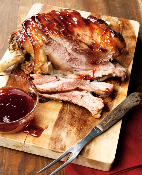 In a saucepan, heat ½ cup Karo corn syrup and ½ cup strawberry or cherry jelly. Stir. When glaze is hot, drip over the ham, and bake.