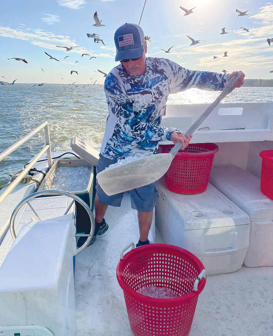 Before setting sail, Jarman fills the 10 coolers aboard Faith & Hope with a couple hundred pounds of ice. With any luck, he’ll send his passengers home with plenty of shrimp — and maybe some flounder and crabs, too. photograph by KAREN LANGLEY MARTIN